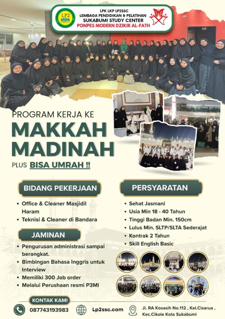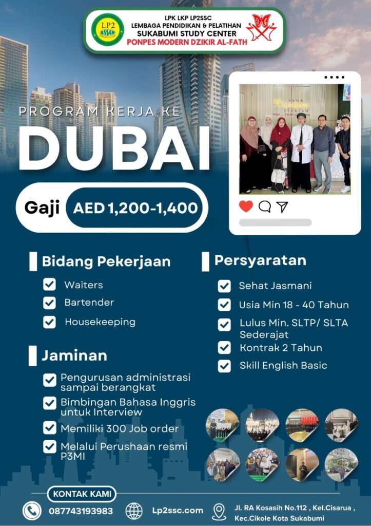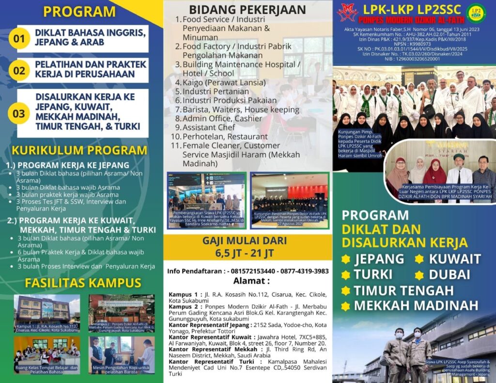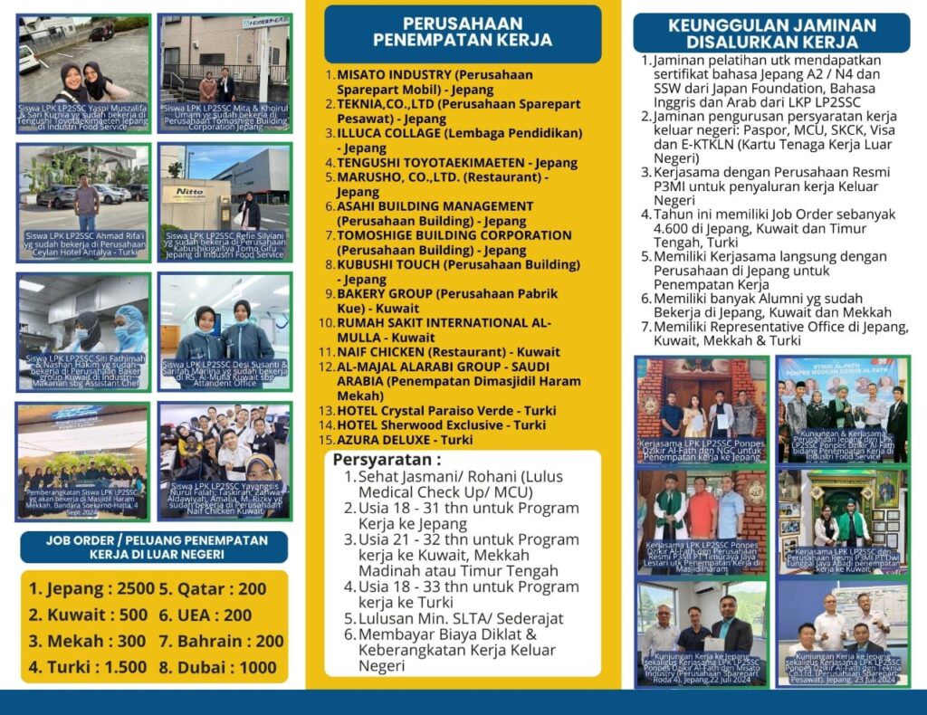 - Lulus Bisa Disalurkan Kerja Keluar Negeri (Jepang, Kuwait, Makkah-Madinah, Turki & Dubai)